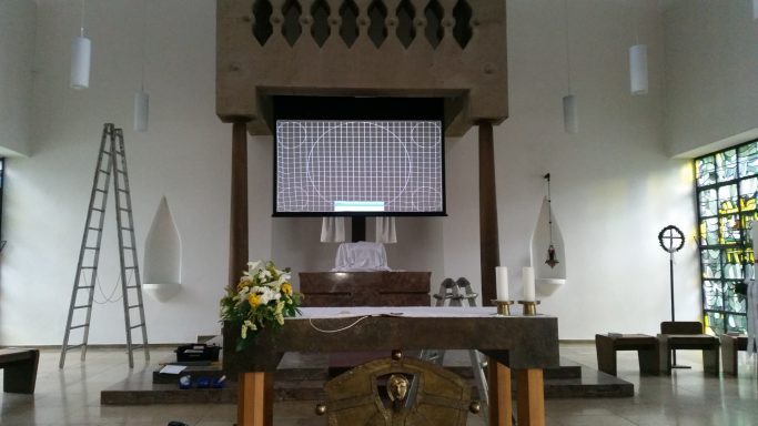 Kurzdistanz-Beamer und elektrisch ausfahrbare Leinwand unter dem Baldachin in einer Kirche