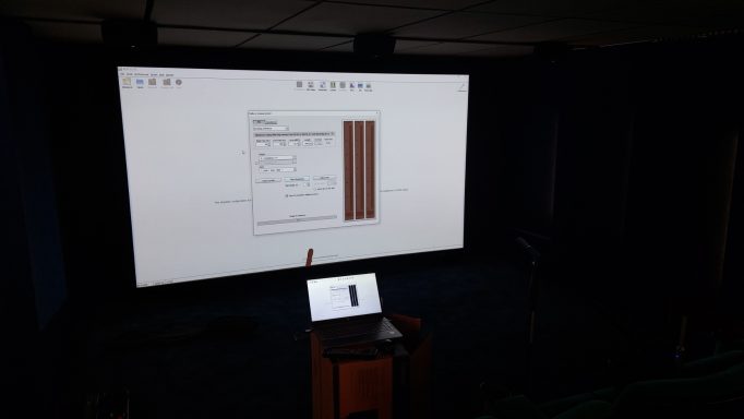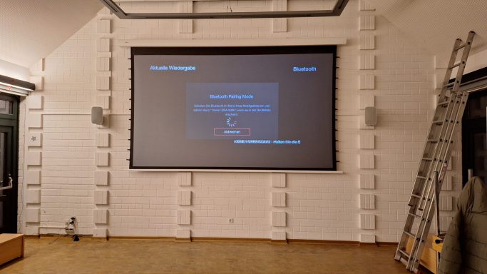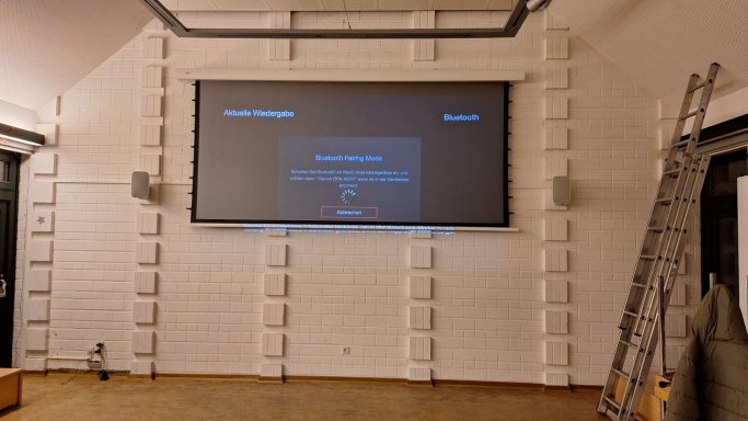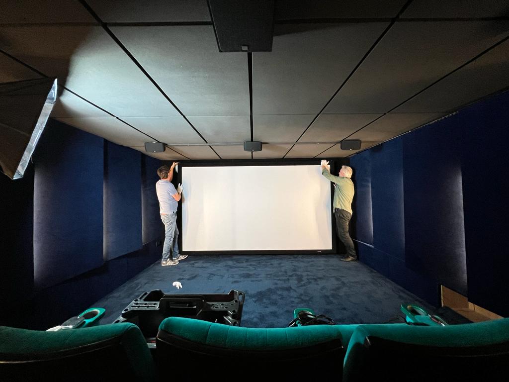 Die Lautsprecher hinter der Schaldurchlässigen Leinwand sorgen dafür, dass der Ton direkt aus dem Bild kommt.