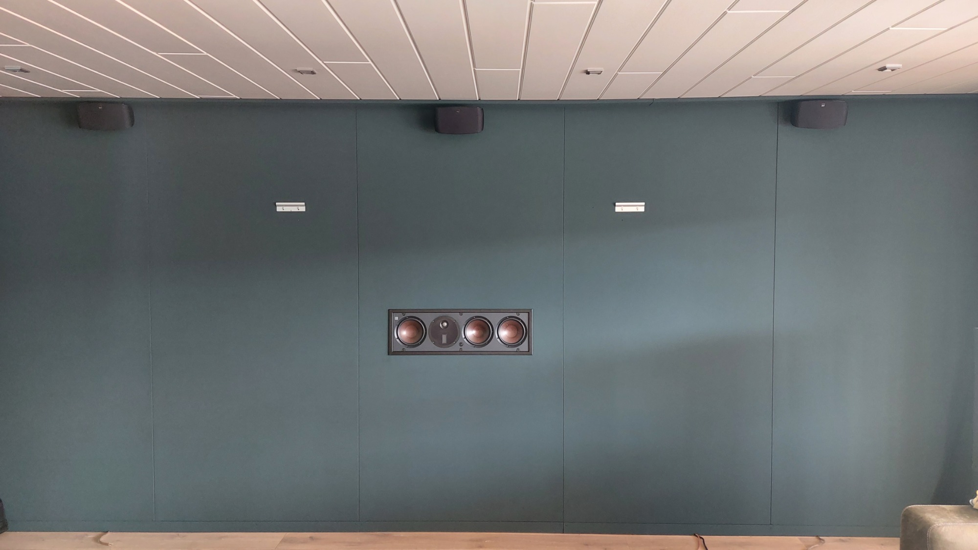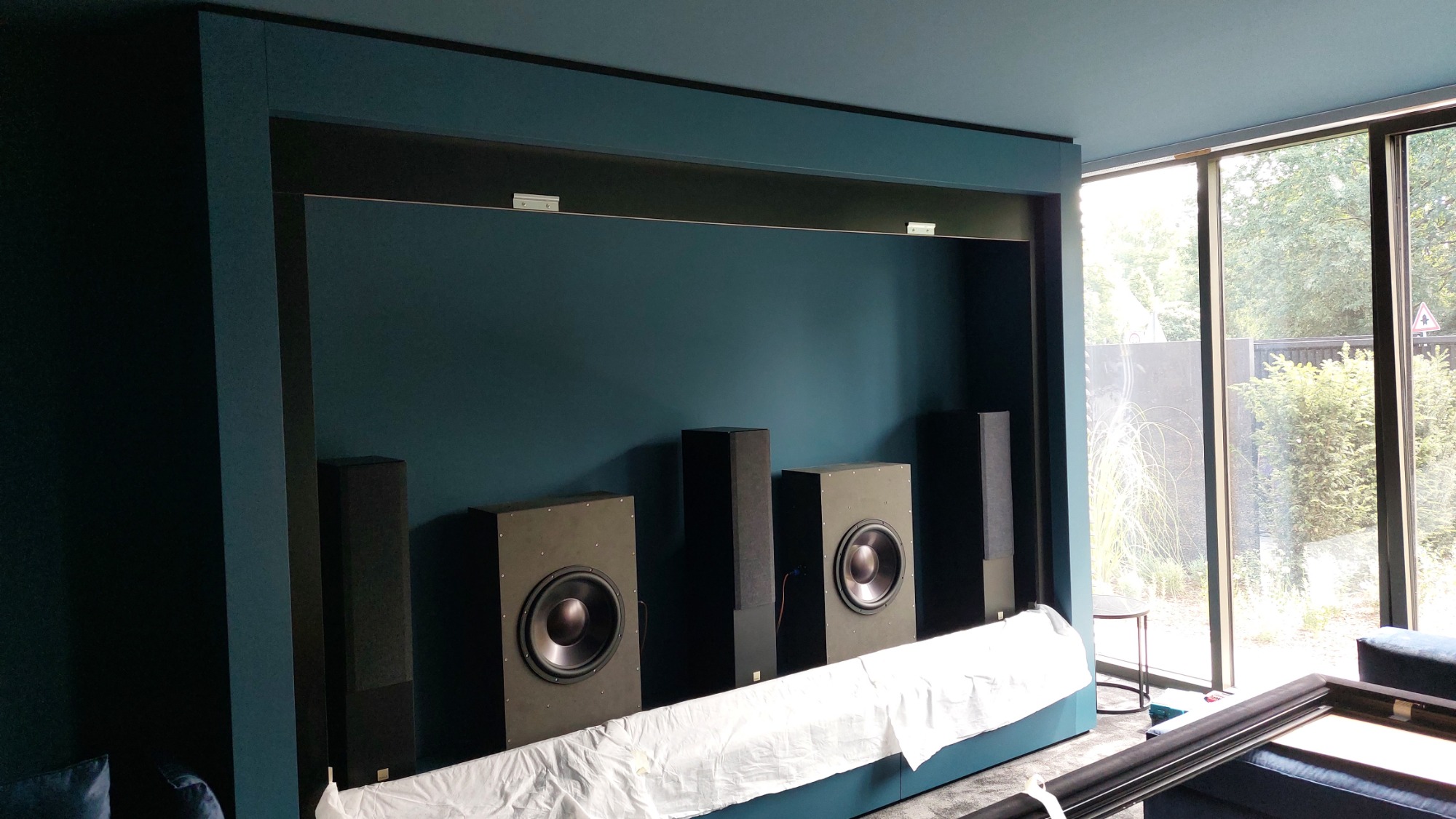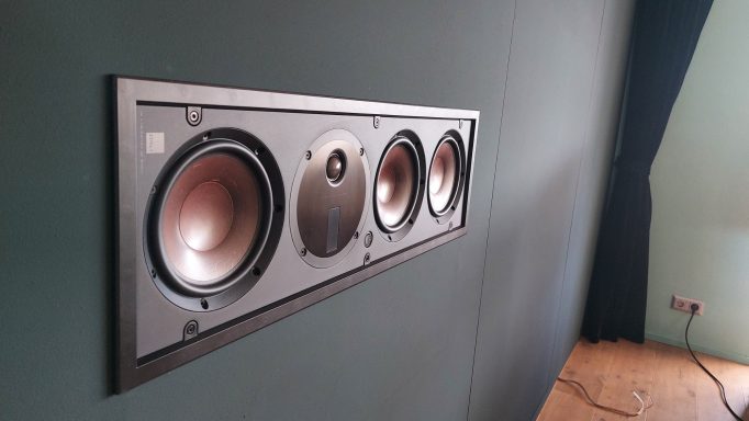 Mächtiger Dali M375 Einbaulautsprecher mit Hybrid-Hochtöner als Center-Speaker hinter der schalldurchlässigen Leinwand