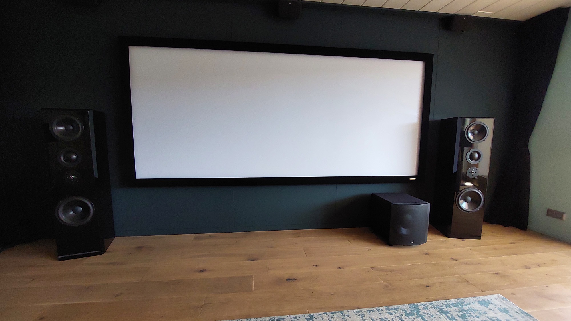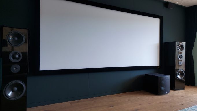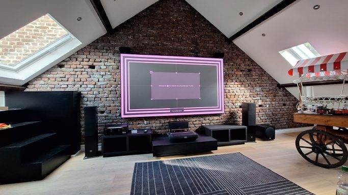 110" CLR-Leinwand umgeben von den schlanken BEC-Lautsprechern