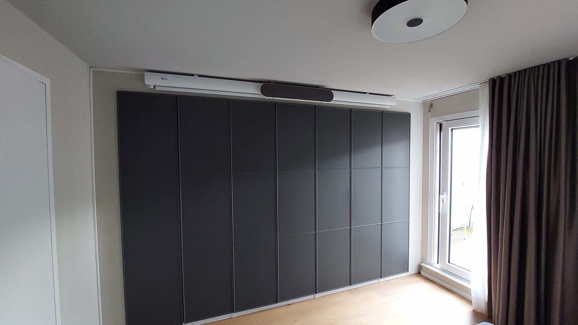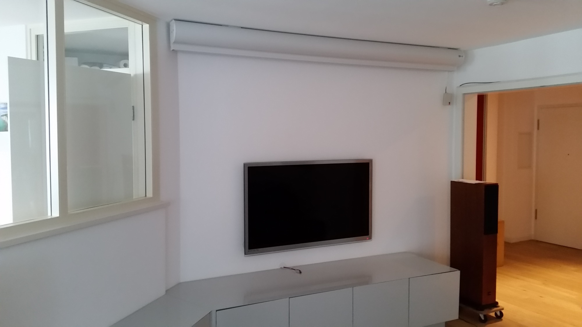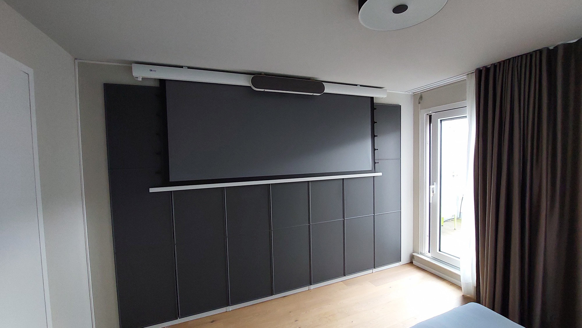 Wenn vor dem Kleiderschrank die 2,44 Meter breite Leinwand herunter fährt, wird das Schlafzimmer zum Kino.