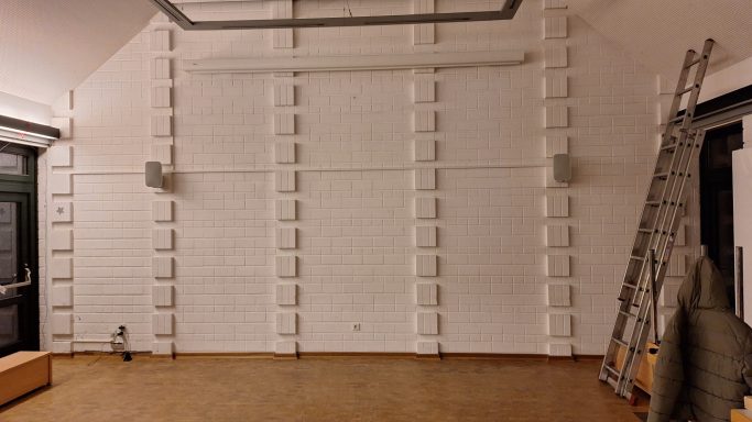 Blick hinter die 3 Meter breite schalldurchlässige Leinwand