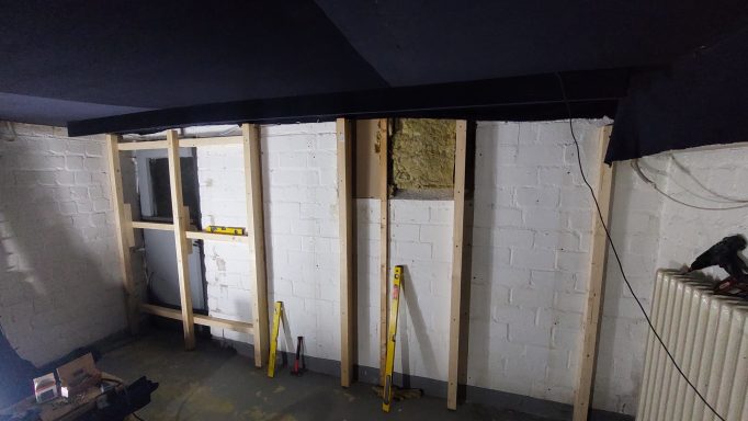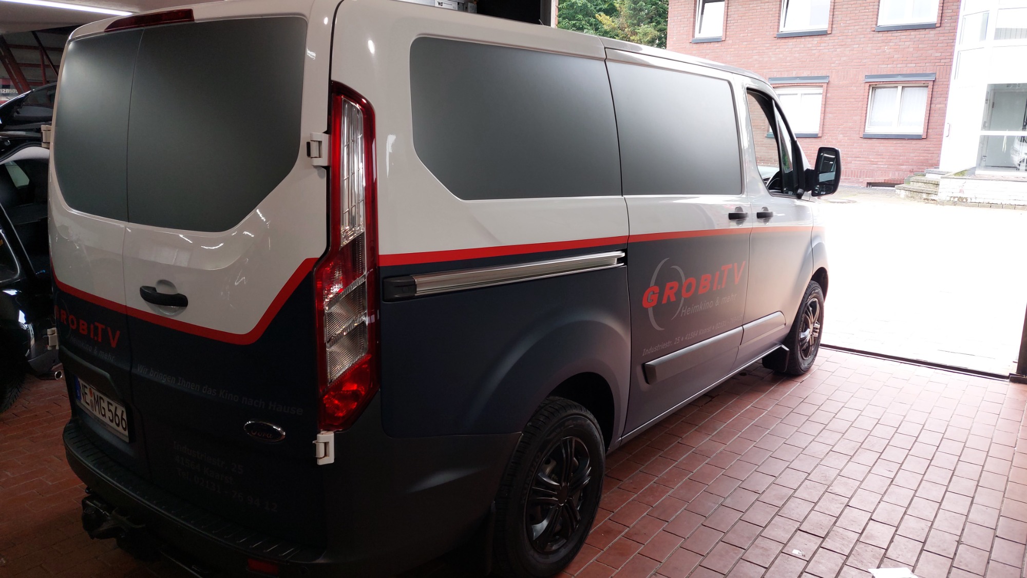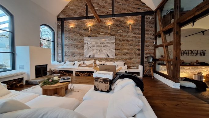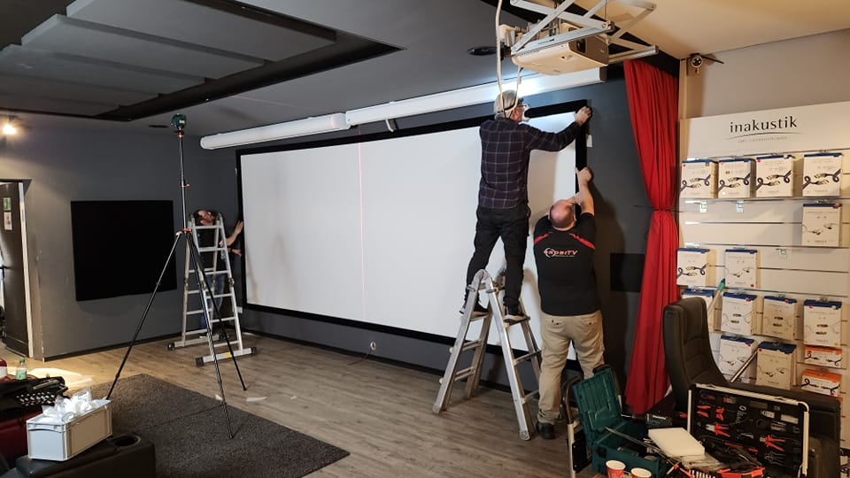 Aufbau einer 4,90 Meter breiten Leinwand in der Ausstellung bei GROBI.TV
