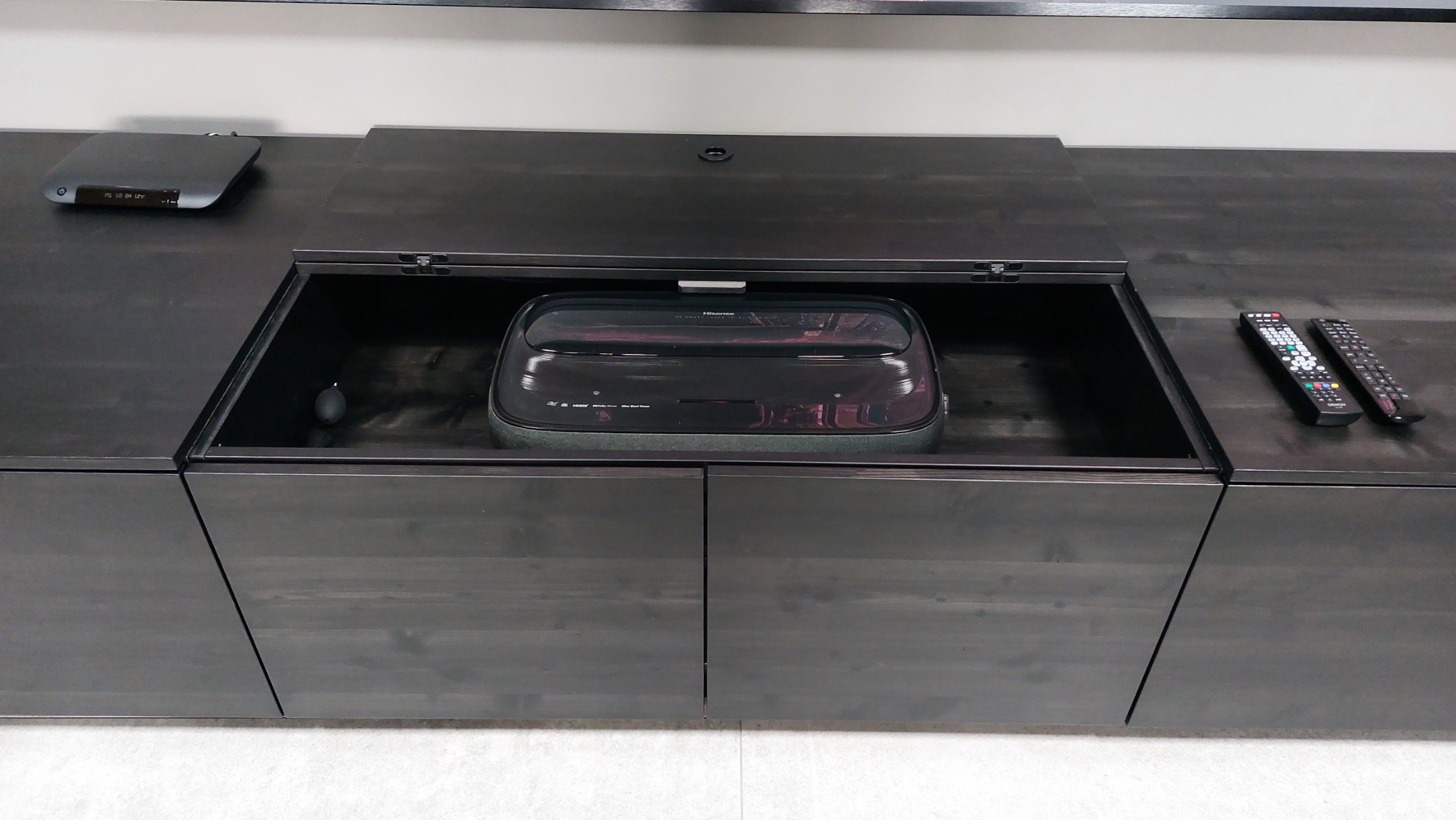 120" Leinwand - Laser TV in elektrischer Schublade des Sideboards.